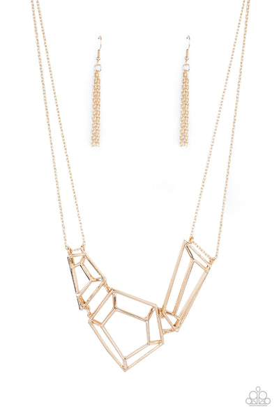 Glistening gold bars connect into edgy 3-dimensional frames below the collar, creating a bold geometric statement piece. Features an adjustable clasp closure.